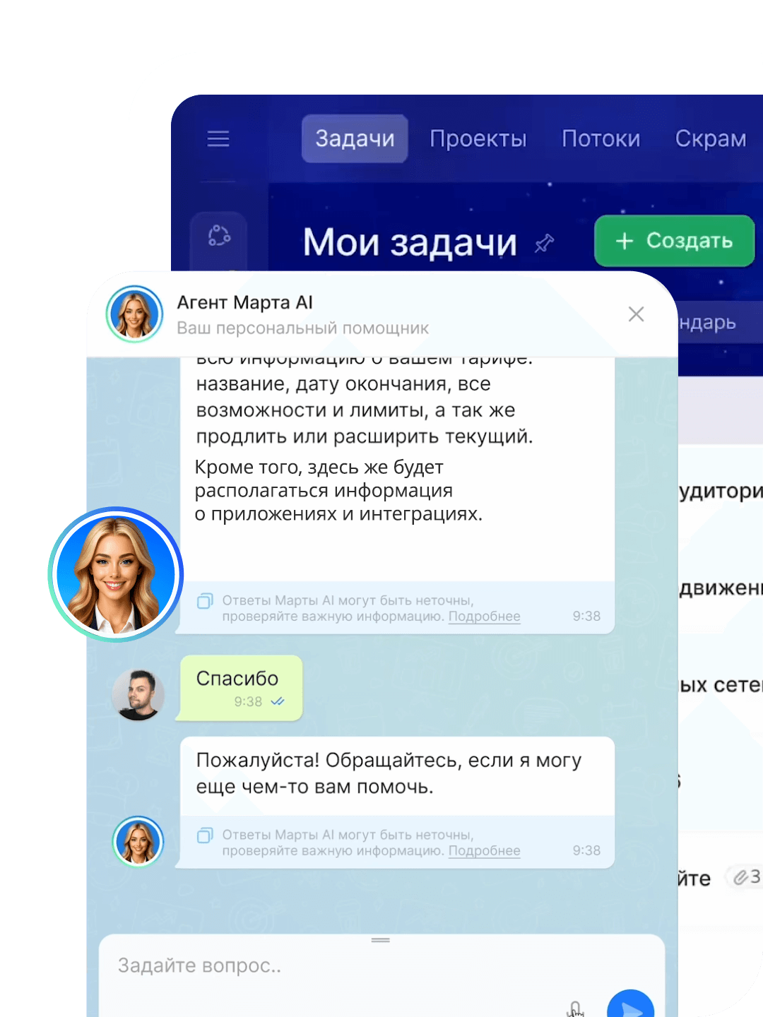 Почта, календари, 1С и другие IT-системы — в вашем Битрикс24. Просто напишите Агенту Марте — она всё сделает.